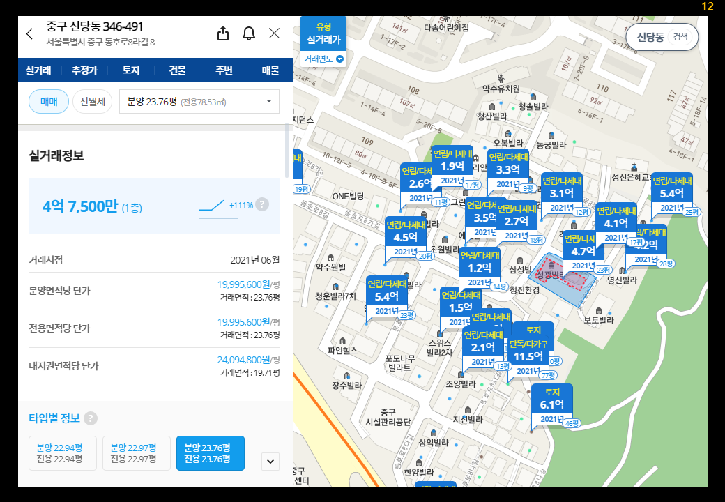- 346지역은 전용24평, 대지면적 19평 물건이 4.75억원에 거래가 되었네요.